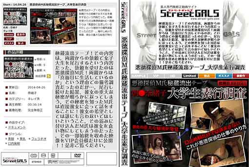 秘蔵流出テープ!その内容は、両親からの依頼で女子大生を尾行するという内容だった。依頼を受けたのは悪徳探偵M氏!両親からは「真面目に生活しているの か」という理由での備考調査だったのだが…。尾行し続けた結果、彼女の重大な秘密が明らかになってしまう。その秘密を知ったM氏は直接彼女に会って話をす ることに!彼女の希望としては誰にも言わないでほしいということ。その弱みに付け込んだM氏は彼女を食い物にしてしまうのだった。その一部始終を収めた映 像をVIP会員様だけに公開!!是非ご覧ください。 無修正 メーカー 和物 素人 女優